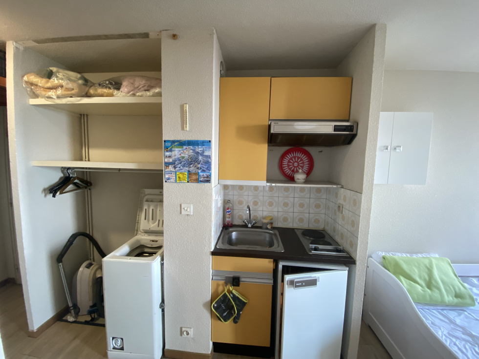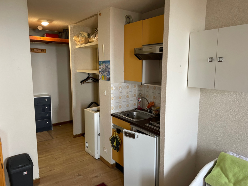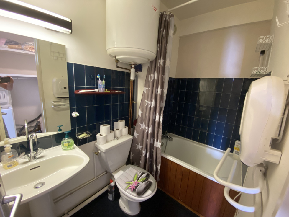 Exposé sud, il dispose d’un balcon avec vue sur les montagnes. À l’origine, le studio comprenait un coin-cabine, offrant la possibilité de recréer cet espace si souhaité. Les radiateurs récents assurent un confort optimal.