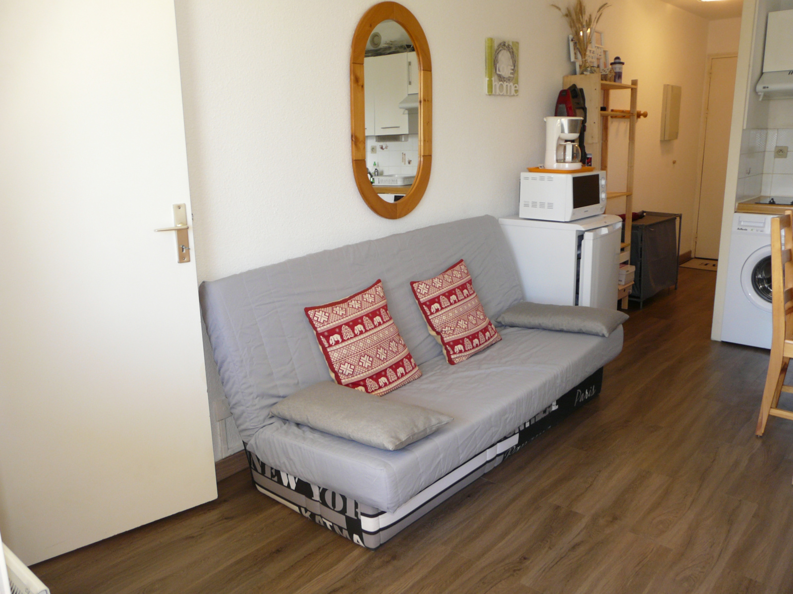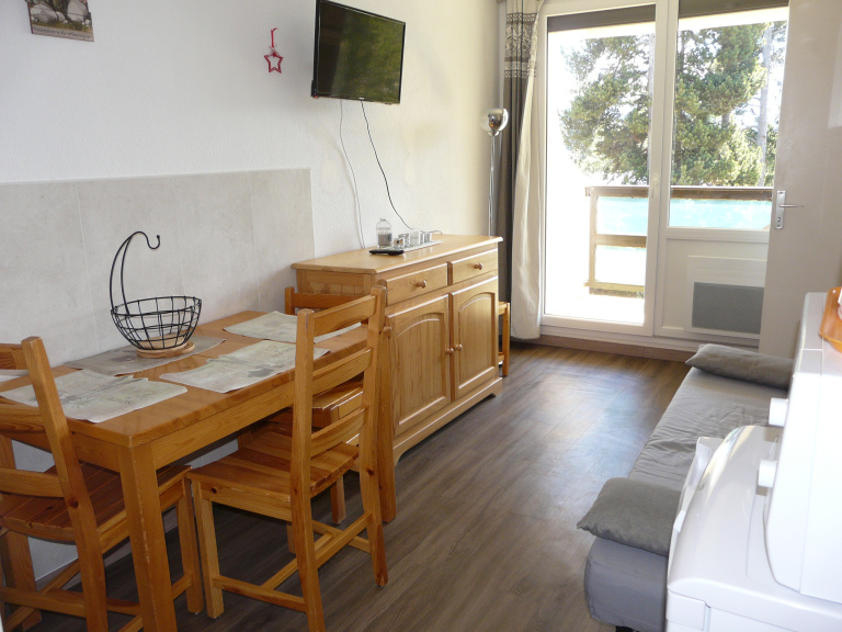 Ce 2 pièces de 24 m², exposé plein sud, a séduit par son parfait état général, son bon ensoleillement et sa terrasse avec vue dégagée sur les sapins et les montagnes environnantes.