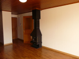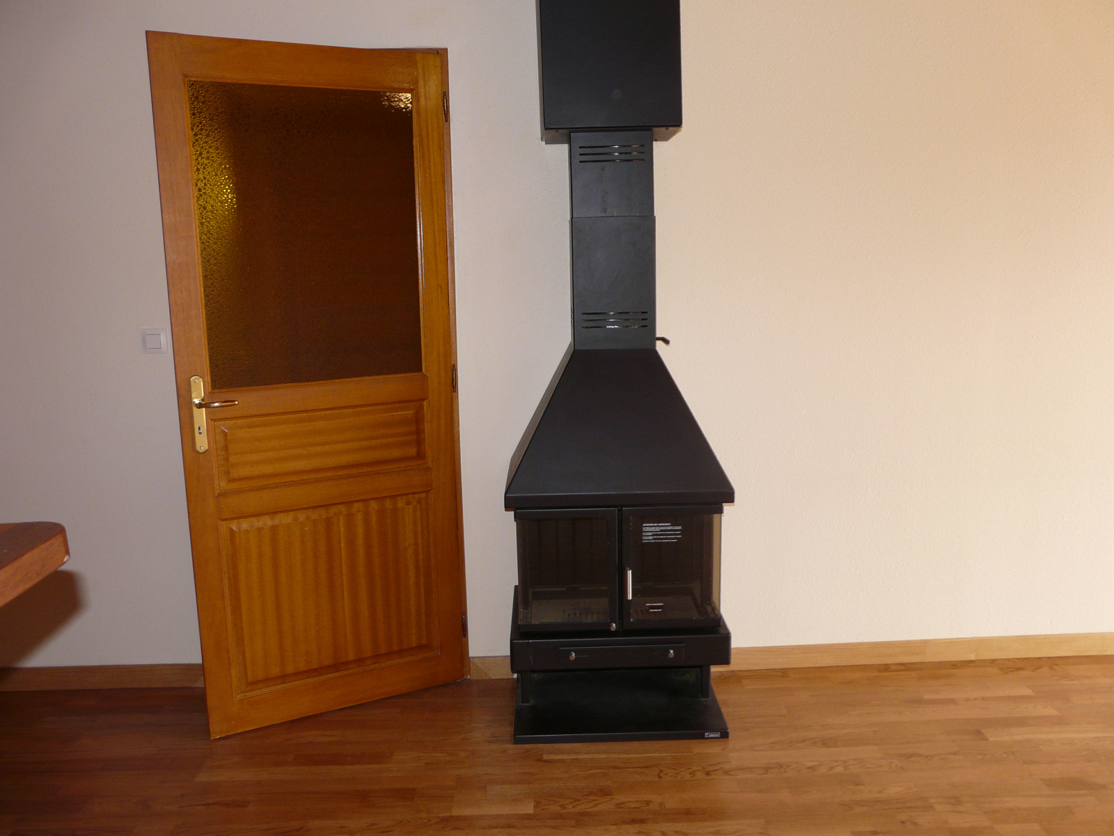 Pièce à vivre confortable avec un poêle à bois et une chambre avec accès direct à la terrasse.