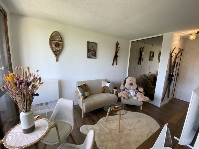 Comprenant : entrée, kitchenette équipée ouverte sur salon-séjour offrant un accès sur une belle terrasse exposée sud, chambre avec fenêtre, salle de bains + wc (machine à laver et sèche serviette inclus), casier à skis, cellier, garage fermé.