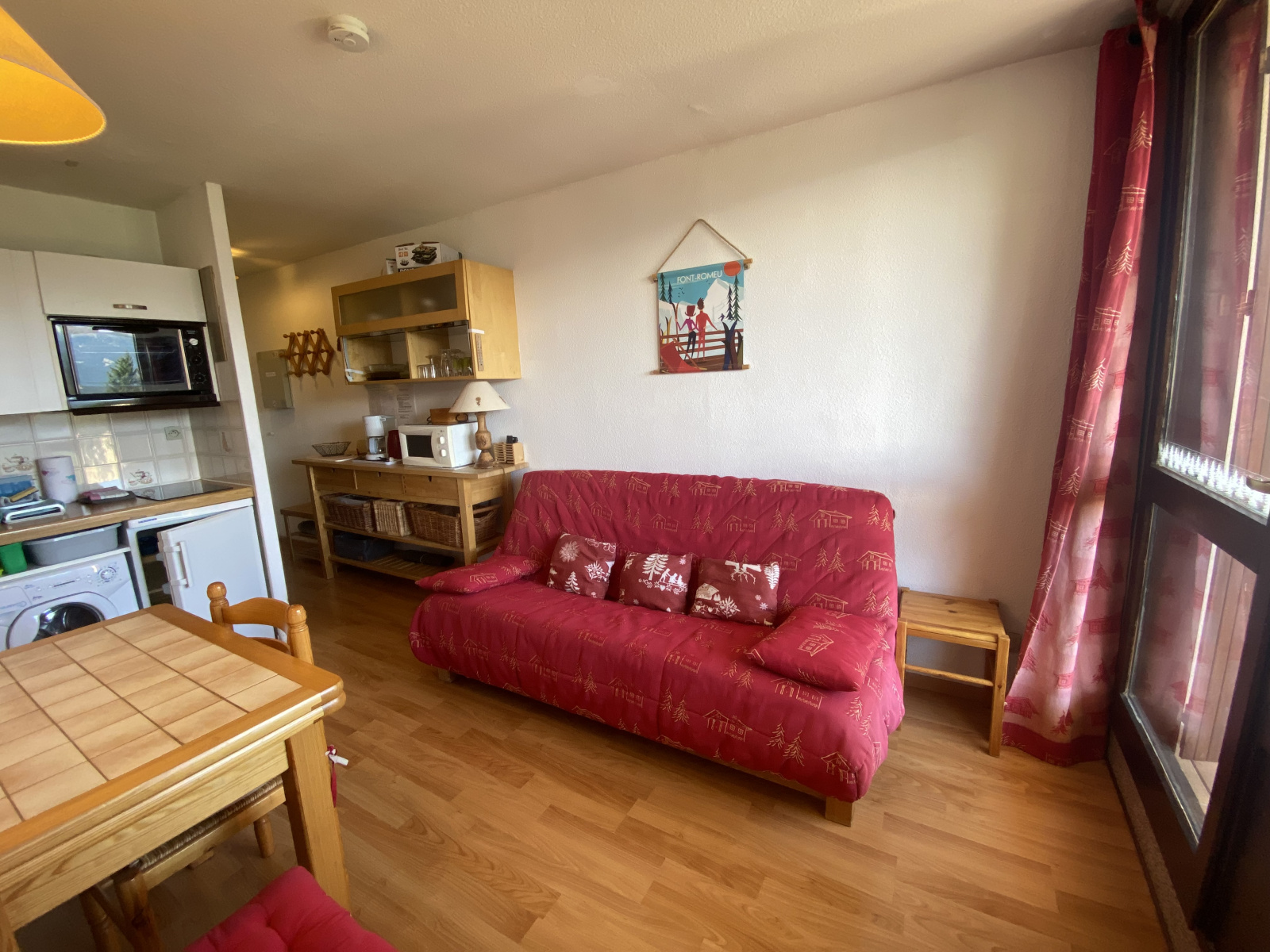 Comprenant : entrée, kitchenette équipée ouverte sur salon-séjour offrant un accès au balcon, chambre (plcards) avec son balcon, salle de bains + wc, casier à skis, garage.
