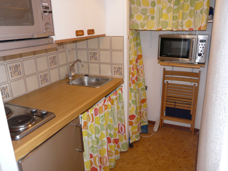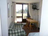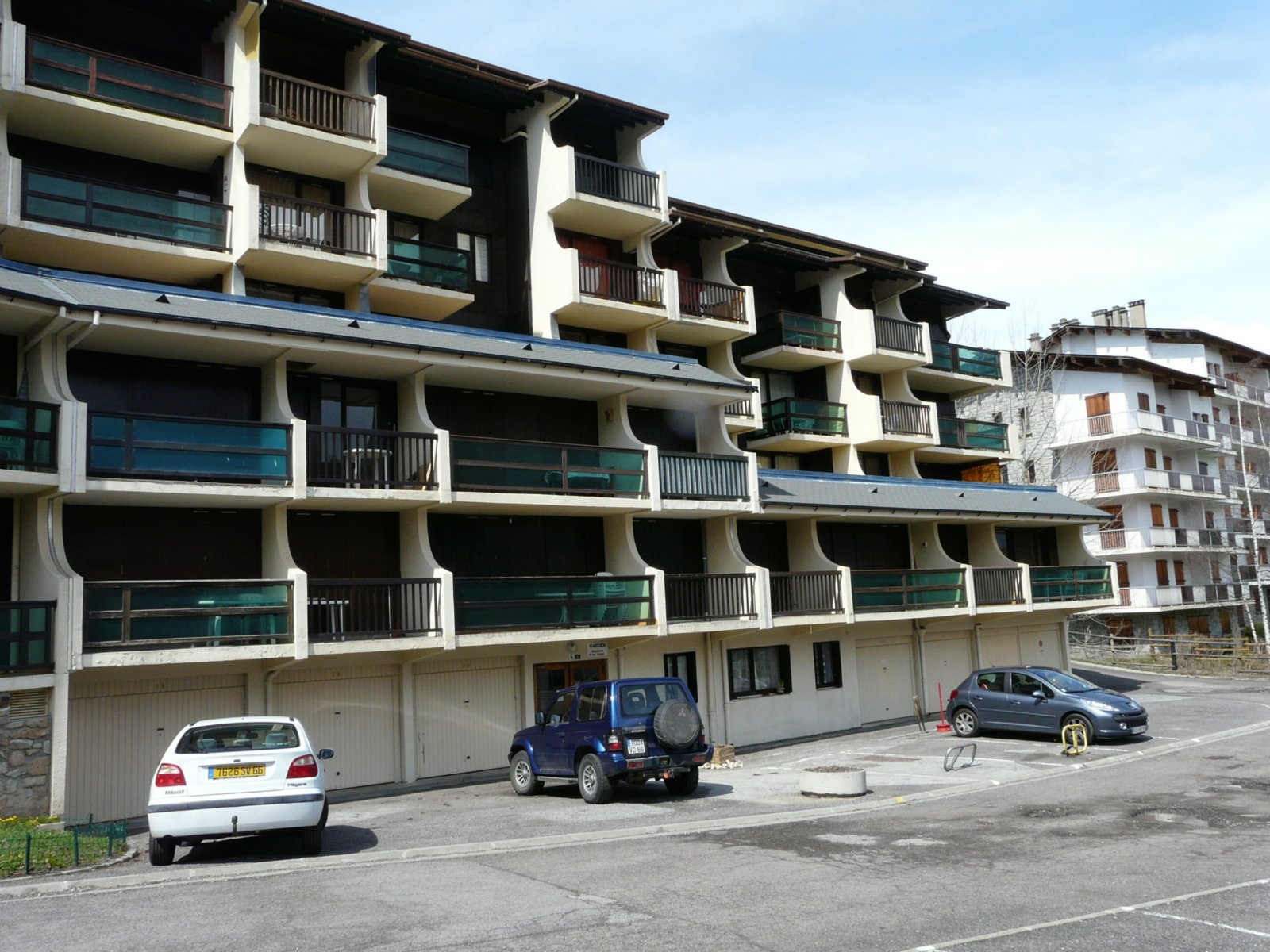 Ce bien fonctionnel offrait une entrée avec coin kitchenette, une chambre, une salle de bains avec WC, un casier à skis, deux caves, ainsi qu’un stationnement privatif extérieur dans la copropriété.