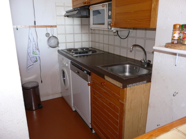 Kitchenette équipée ouverte sur un salon-séjour lumineux donnant sur le balcon