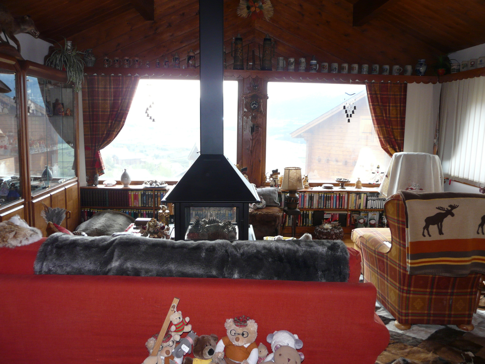 Grande pièce à vivre de 60 m² avec poêle à bois central et cheminée, offrant un espace convivial et chaleureux.