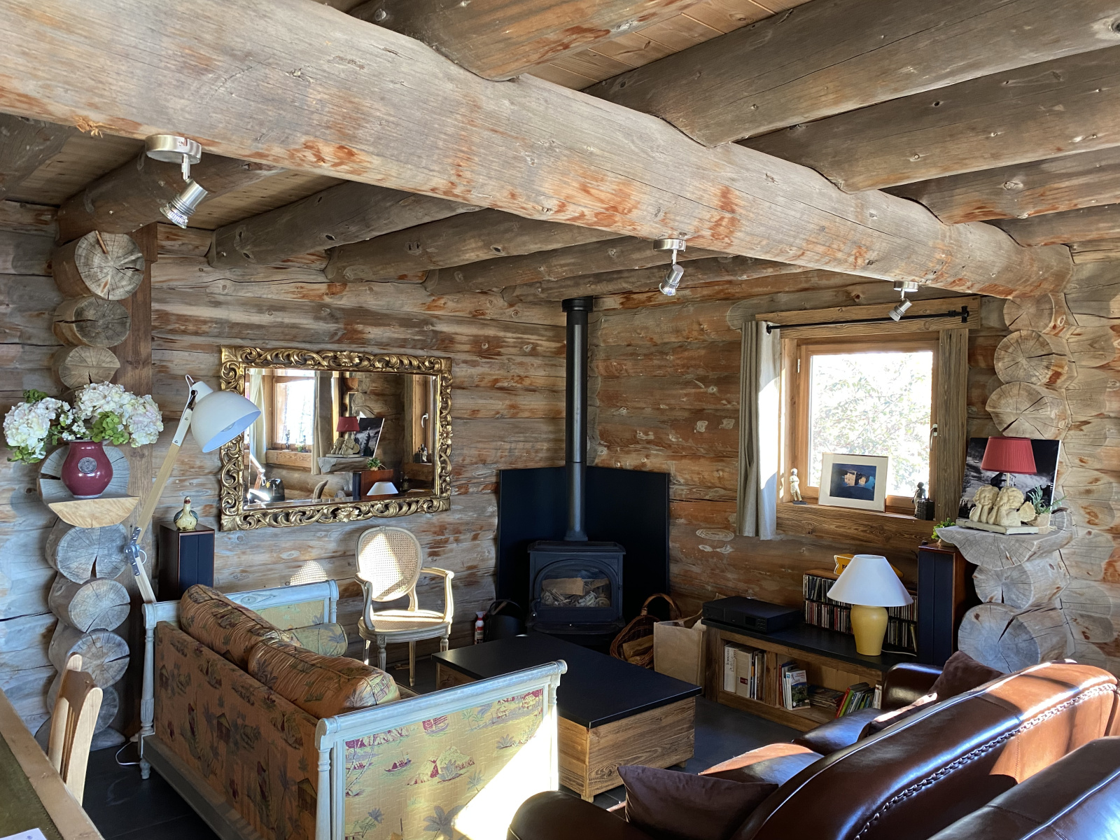 Pièce à vivre de 80 m² avec double salon et poêle à bois.