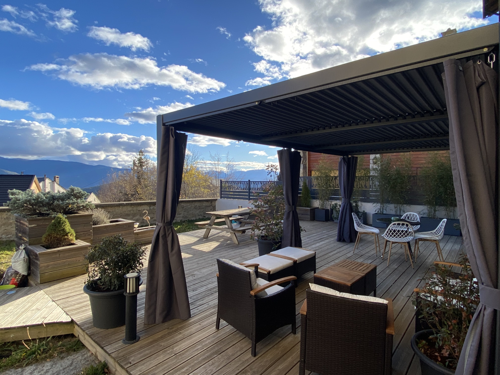 Le salon, pièce maîtresse du rez-de-chaussée, s’ouvre sur une terrasse/jardin privatif de 180 m² environ. Cet espace extérieur permet de profiter pleinement de l’ensoleillement généreux de la Cerdagne, de déjeuner dehors, de recevoir, de lire, de jardiner ou simplement de contempler le paysage environnant.