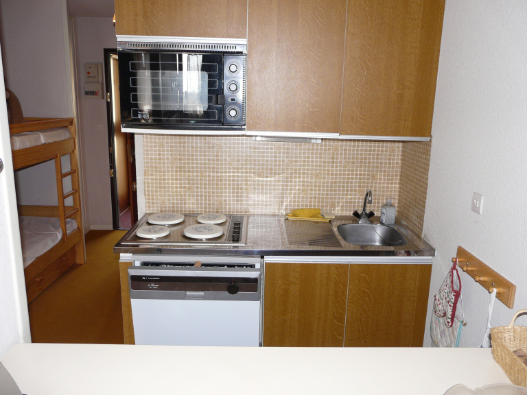 Le logement comprend une entrée avec coin-cabine, une kitchenette équipée ouverte sur le salon-séjour donnant sur le balcon, une salle de bains avec WC, un casier à skis, un box voiture et un parking extérieur.