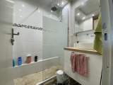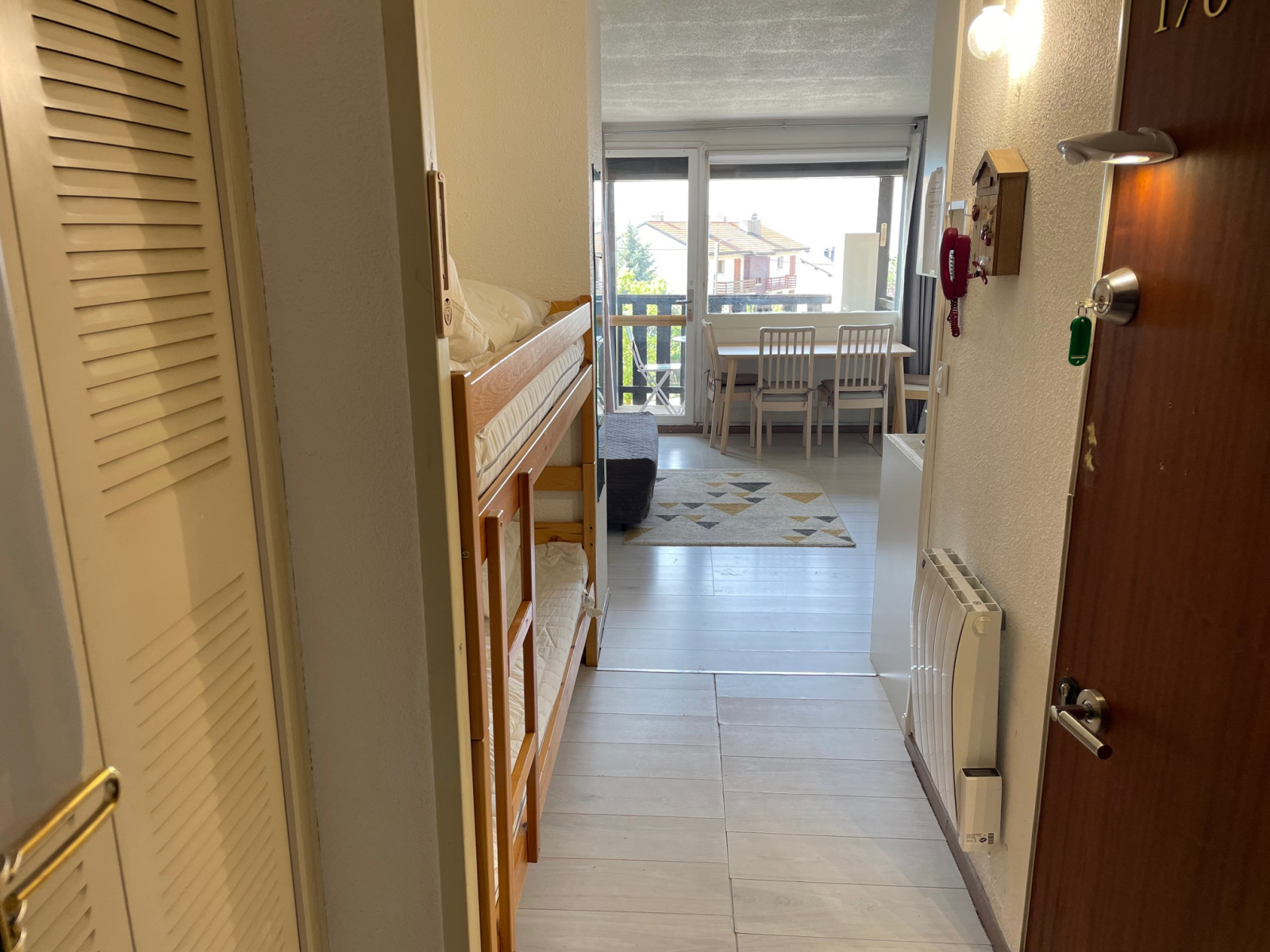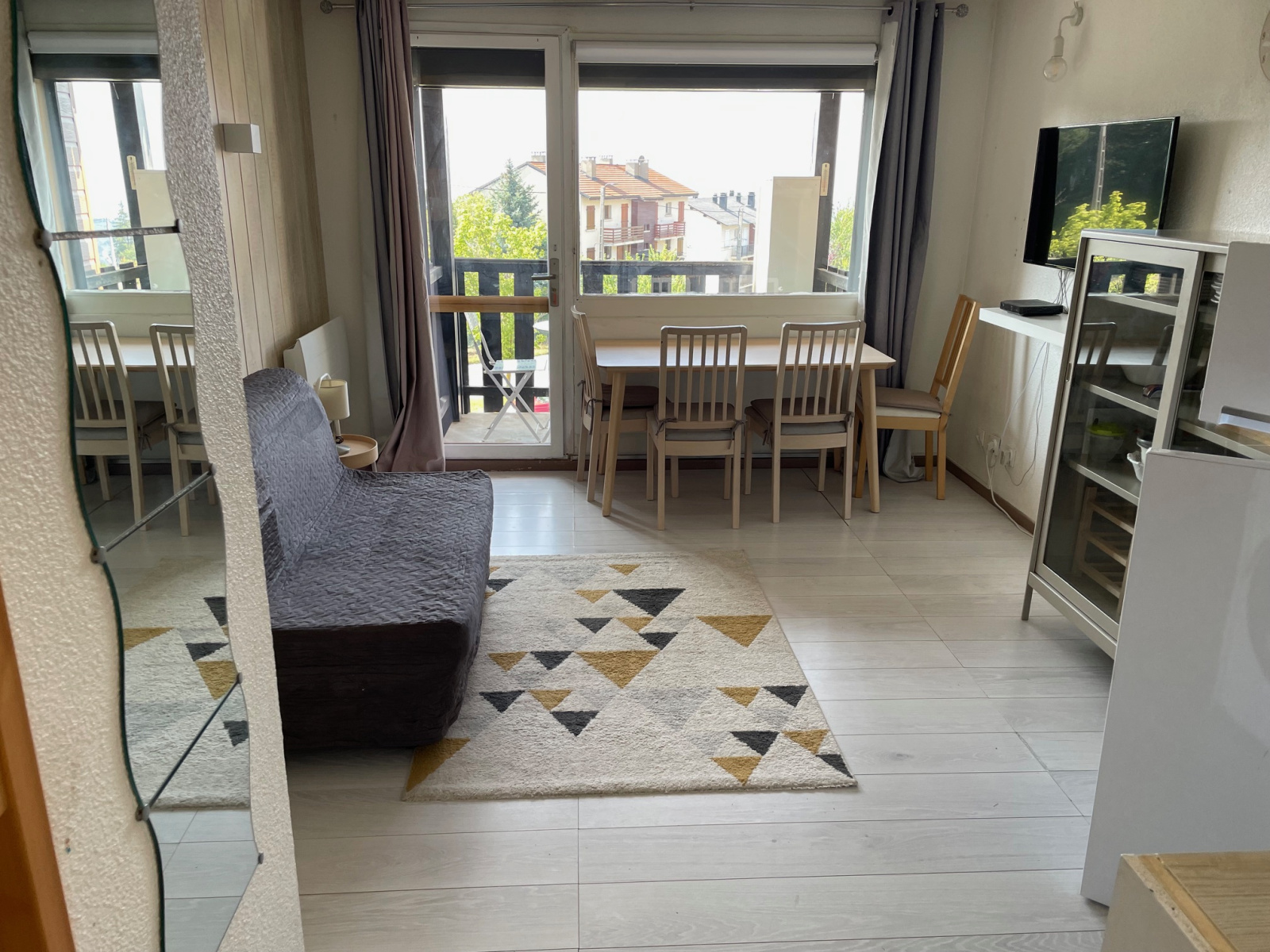 La pièce principale lumineuse avec parquet ouvre sur un balcon exposé sud, offrant une vue dégagée sur les montagnes. Le bien est équipé d’un tableau électrique récent, de radiateurs modernes et d’une douche à l’italienne.