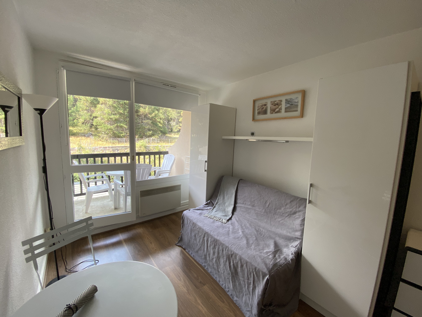 Situé à proximité immédiate du centre-ville de Font-Romeu, ce studio-cabine de 17,27 m², en parfait état et entièrement parqueté, a séduit par son emplacement recherché, son environnement naturel et sa fonctionnalité. Il disposait d’une agréable terrasse de 4,39 m², exposée nord-ouest, offrant une vue dégagée sur la forêt, dans un cadre calme et reposant.