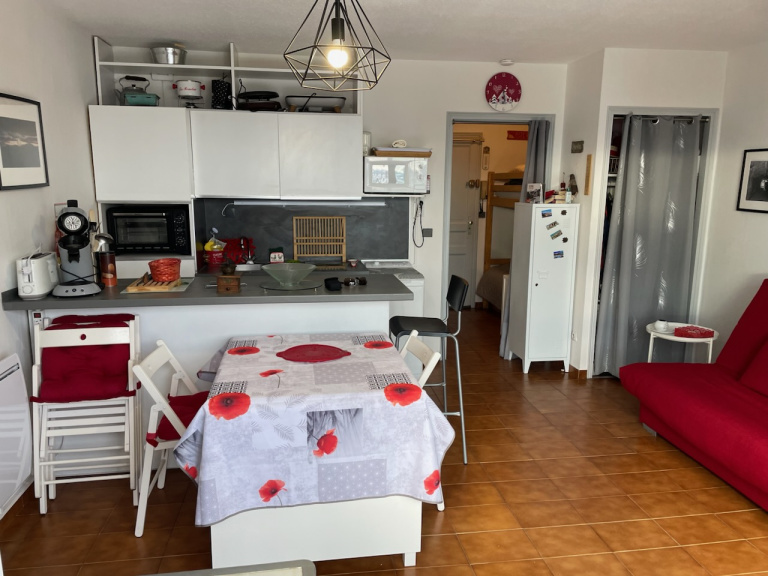L’appartement se compose d’une grande pièce à vivre lumineuse, offrant un espace confortable et fonctionnel, facilement aménageable en coin salon, espace repas et couchages. Grâce à son exposition privilégiée, la pièce bénéficie d’une belle luminosité tout au long de la journée.