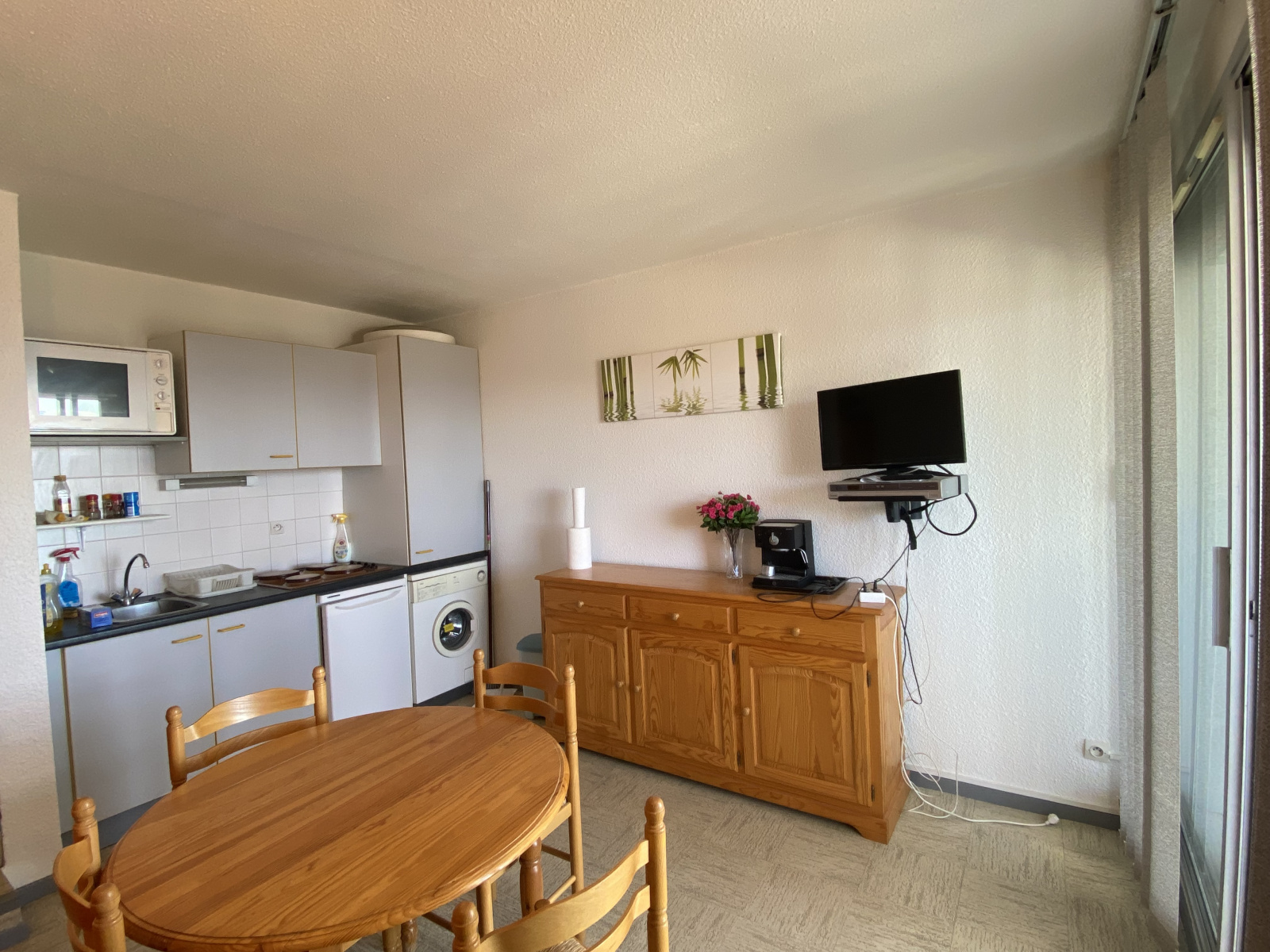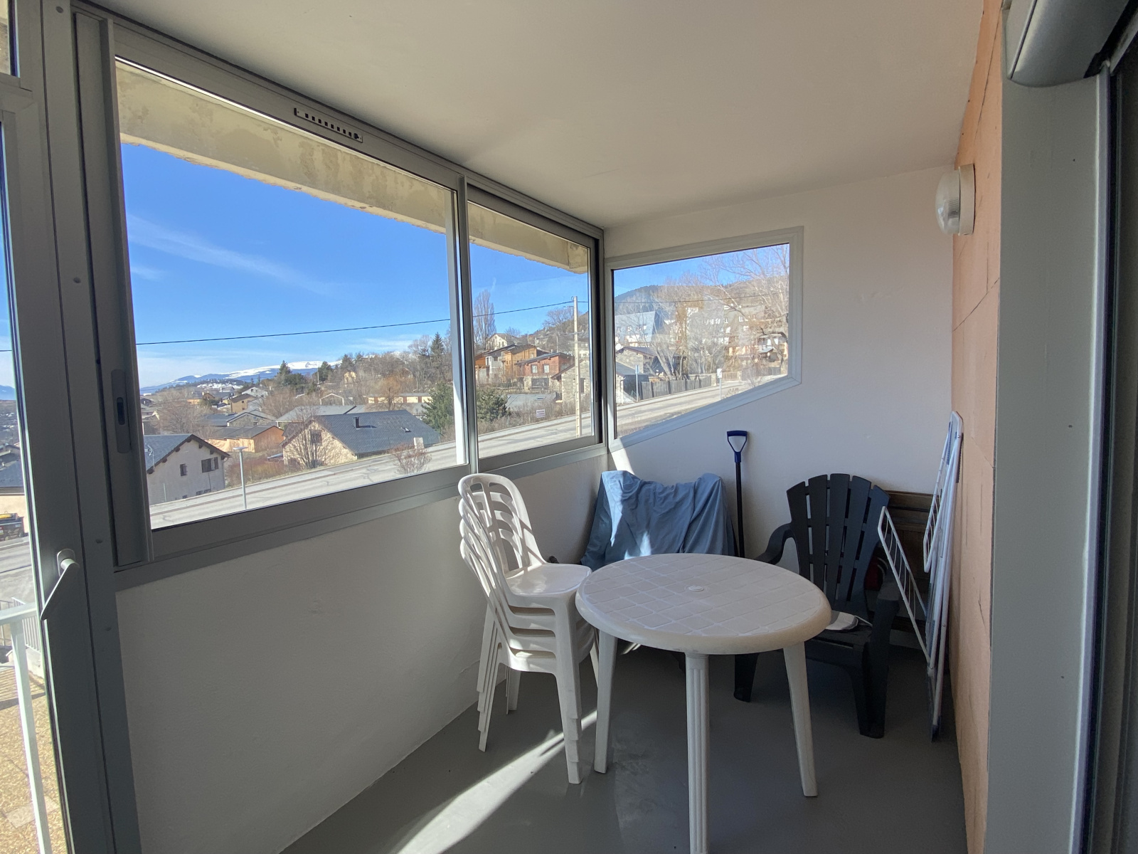 La pièce à vivre, spacieuse et lumineuse, comprend une kitchenette équipée et s’ouvre directement sur la loggia fermée qui constitue un véritable espace supplémentaire utilisable toute l’année. Les volets roulants électriques et les huisseries récentes en double vitrage assurent confort et tranquillité.