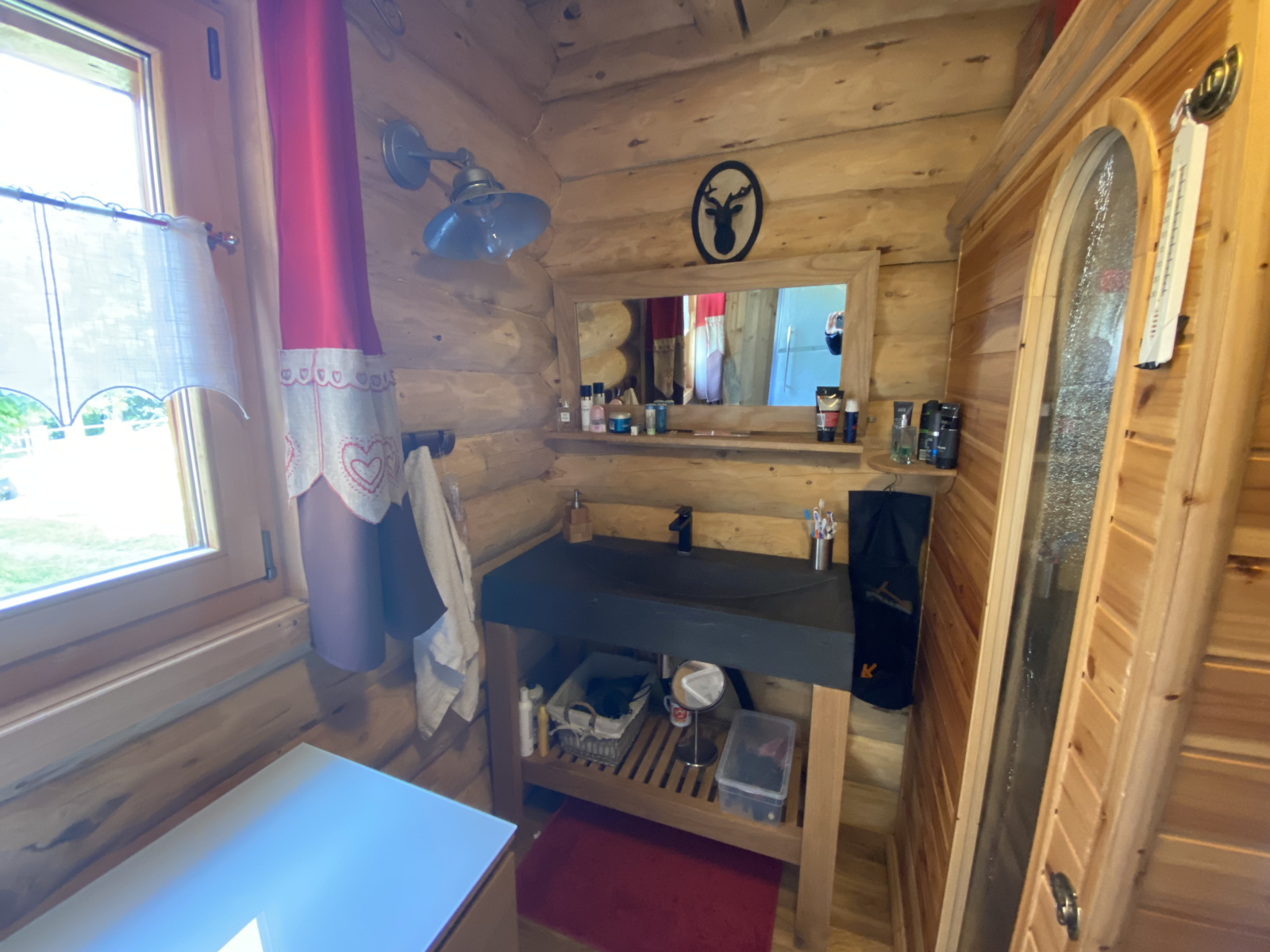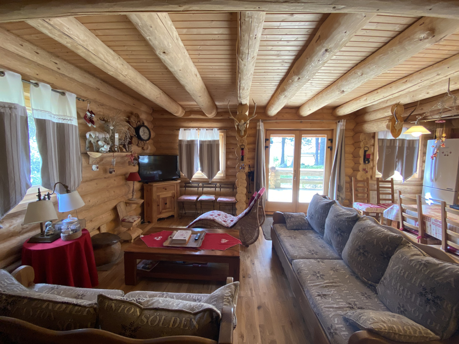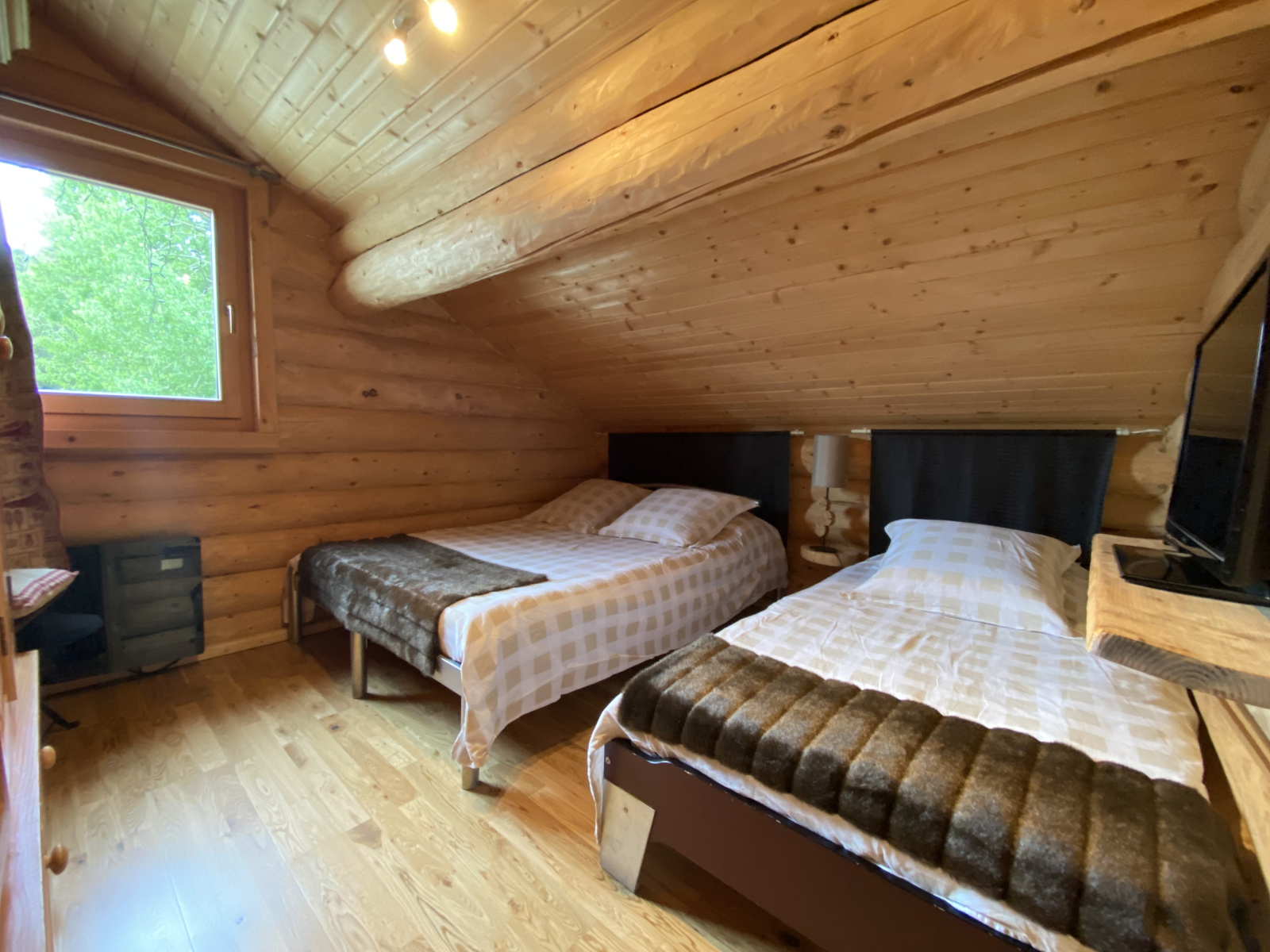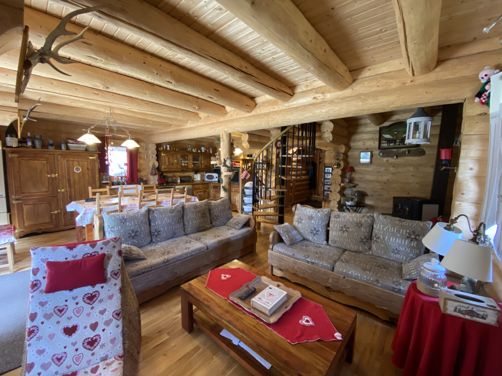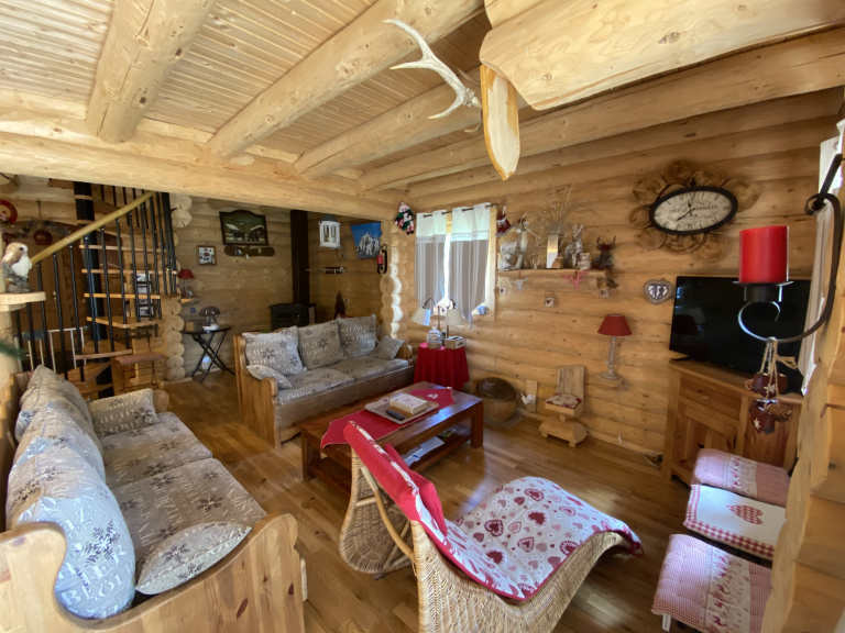 Comprenant : Rez-de-chaussée : hall d'entrée, cuisine équipée ouverte sur salle à manger, salon avec poêle à granulés offrant un accès sur une belle terrasse et jardin, salle d'eau + sauna, buanderie + wc, cellier commun avec le chalet voisin, parking extérieur devant chalet.