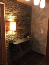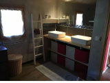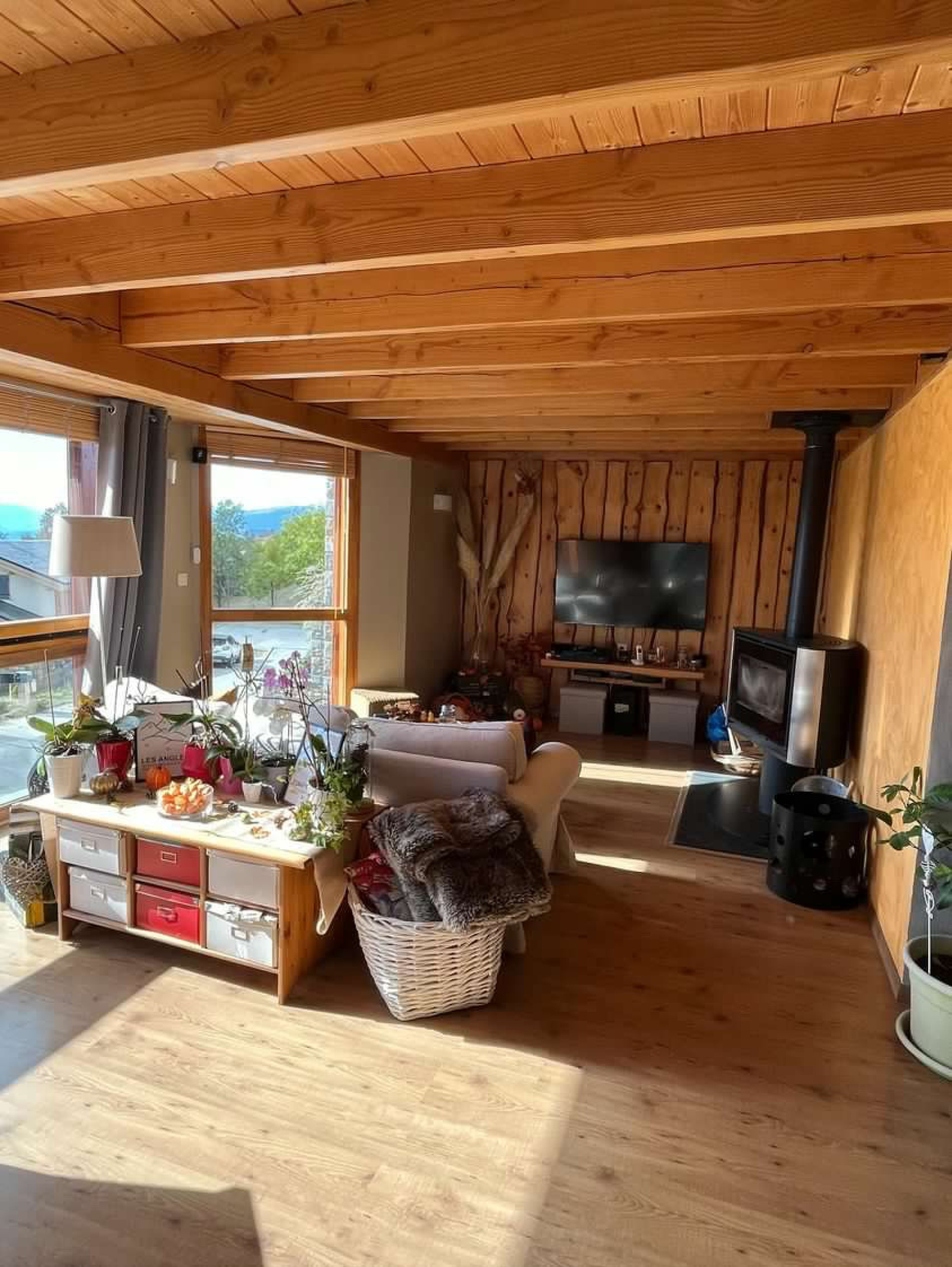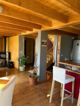 Niveau principal : Cuisine équipée ouverte sur salle à manger, salon avec poêle à bois, petite chambre ou pièce pouvant devenir un dressing, WC indépendant.